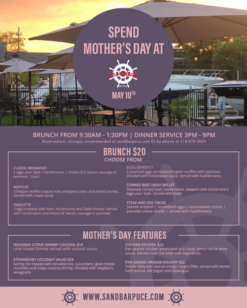 Welcome to the Sandbar, a gem on Lake St. Clair in the heart of downtown Puce. Owned and operated by Keith Golla, who brings over 30 years of restaurant experience, including more than 20 years at the Sandbar. We pride ourselves on offering a top-notch dining experience. Whether you’re arriving by boat or car, our location is perfect for a relaxing lunch while enjoying the local waters.
